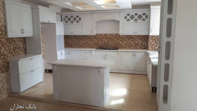 کابینت آشپزخانه ممبران ایرانی با رنگ سفید و جزیره بزرگ