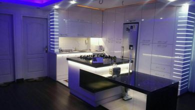 آشپزخانه مدرن سفید با نورپردازی ویژه و سنگ کورین مشکی