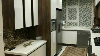 آشپزخانه کوچک ایرانی با کابینت مدرن سفید و طرح چوب