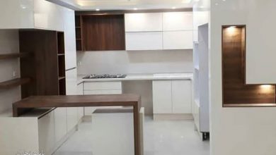 کابینت مدرن ایرانی ام دی اف سفید هایگلاس و طرح چوب